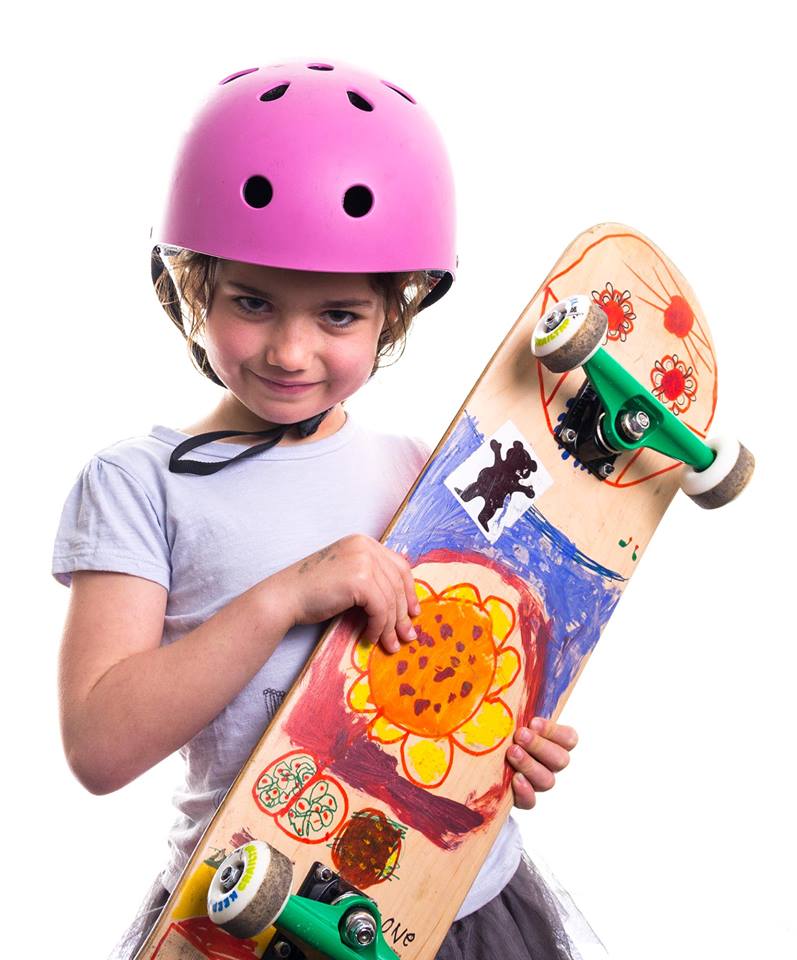 Ione has been getting into the DIY spirit and has sanded down her board (with a little help from her skateboarder Dad) and personalised it herself with her very own board graphics! She has even painted her own clothes, her approach is pretty fresh and free from any brand loyalty and knowledge of skaters and the ‘scene’, which we really admire!