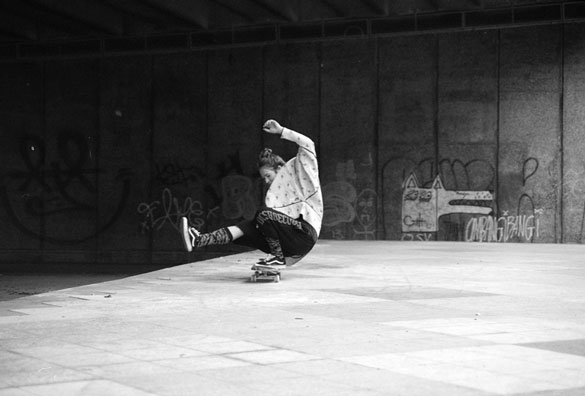 Inspired by 80′s and 90′s skate, Photographer Liz Seabrook and stylist Sara Wilson spent a day with skater Lois Pendlebury. Cruising round the diverse paths of Hackney Wick: from car parks to colourful street corners. While snapping shots, they also had some time to get a quick Q&A in with the gnarly gal.