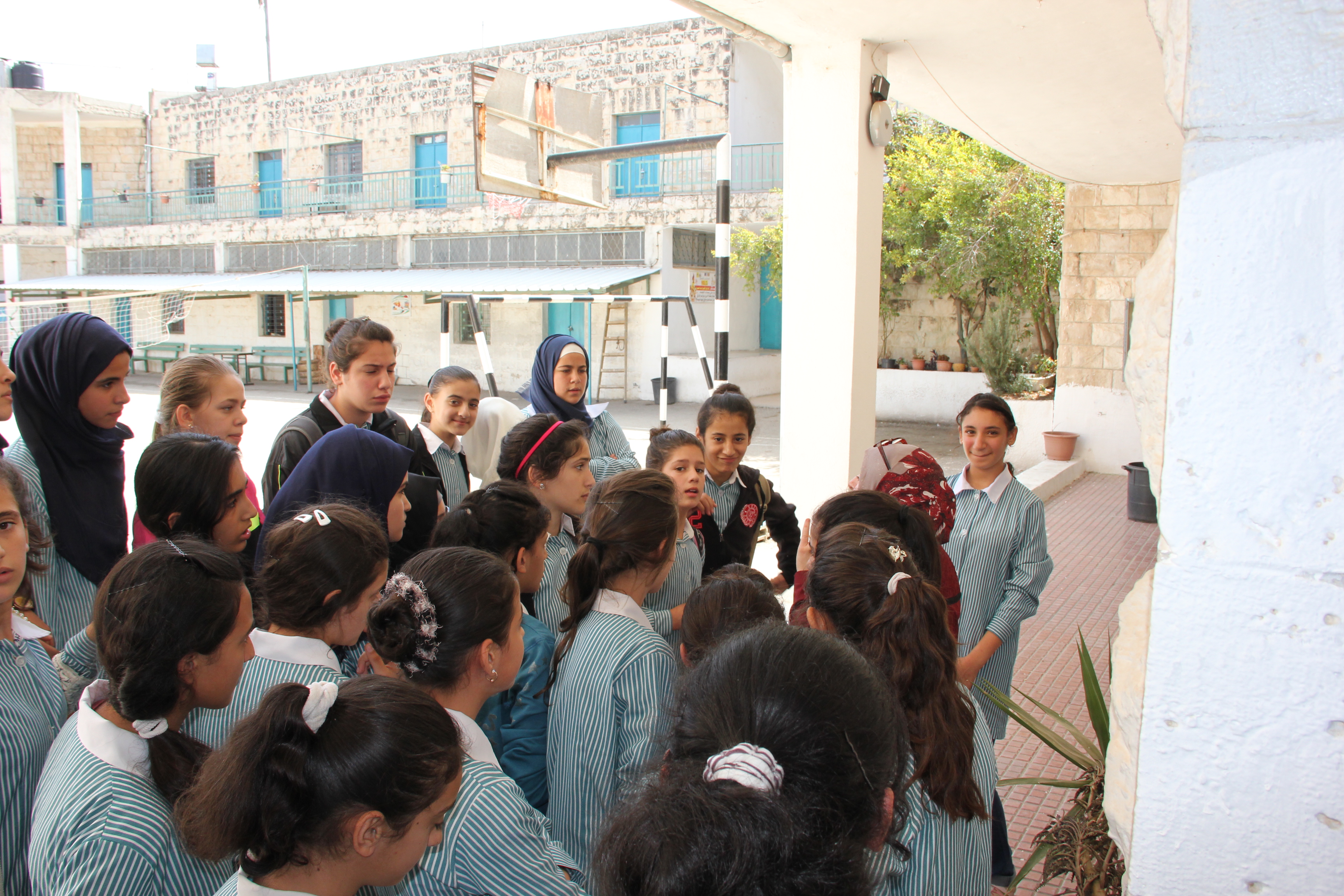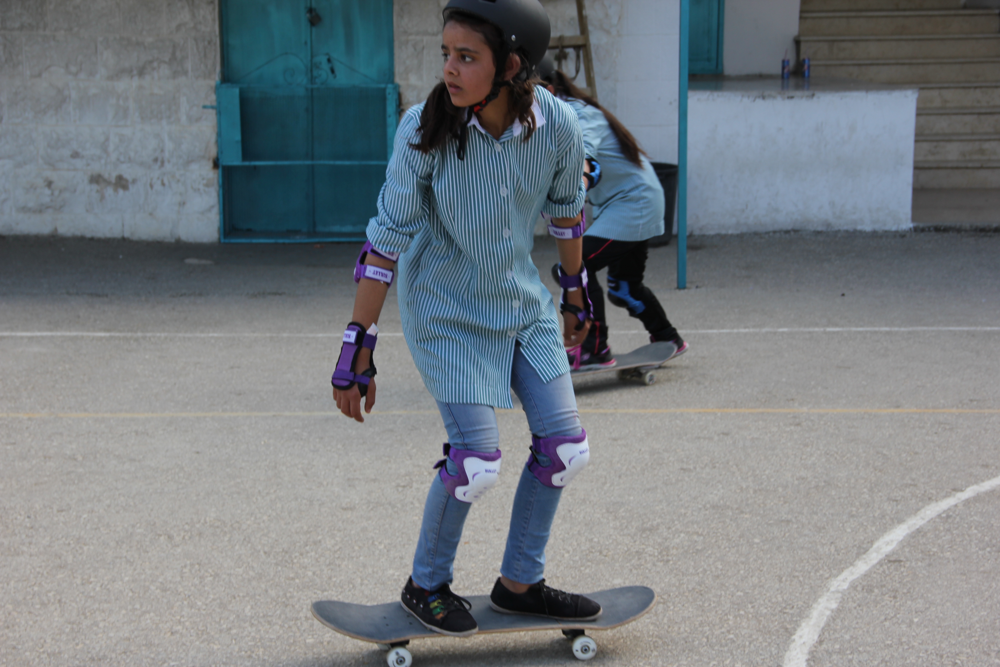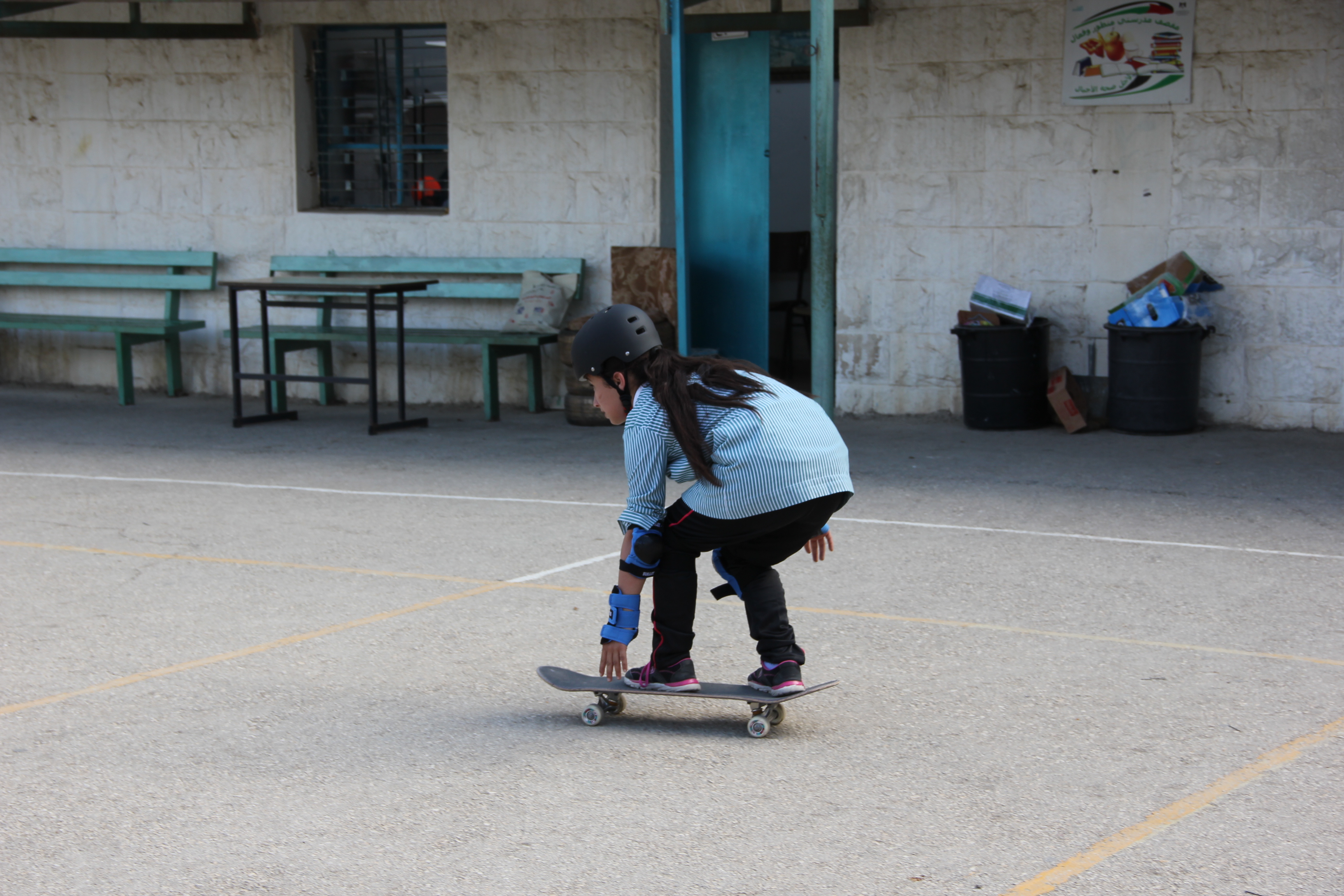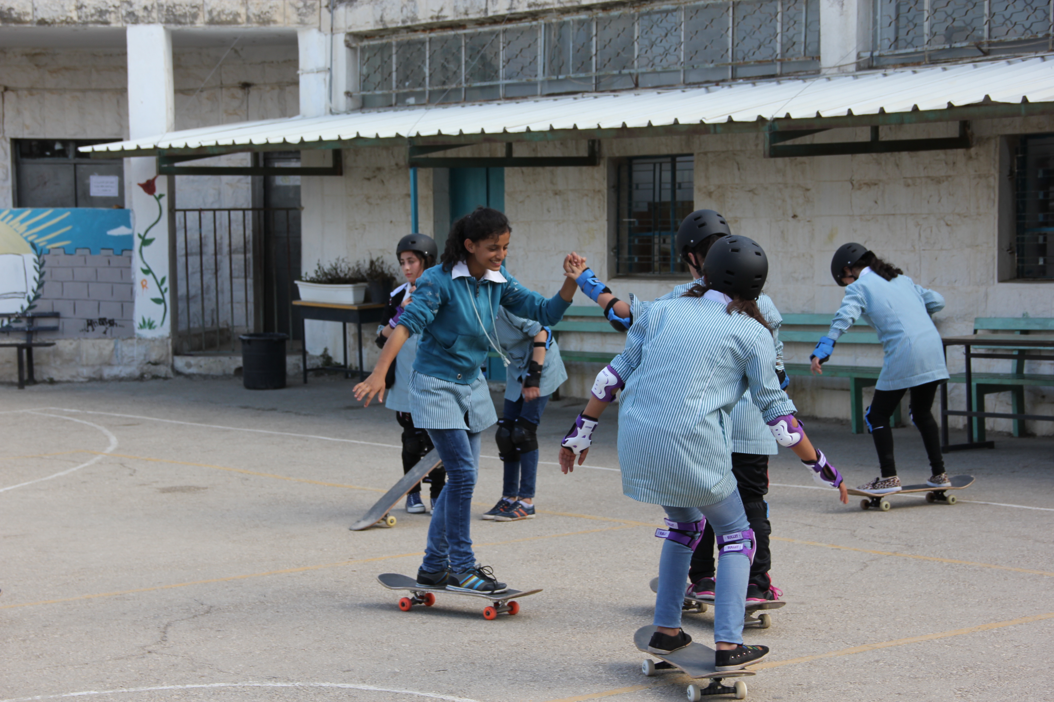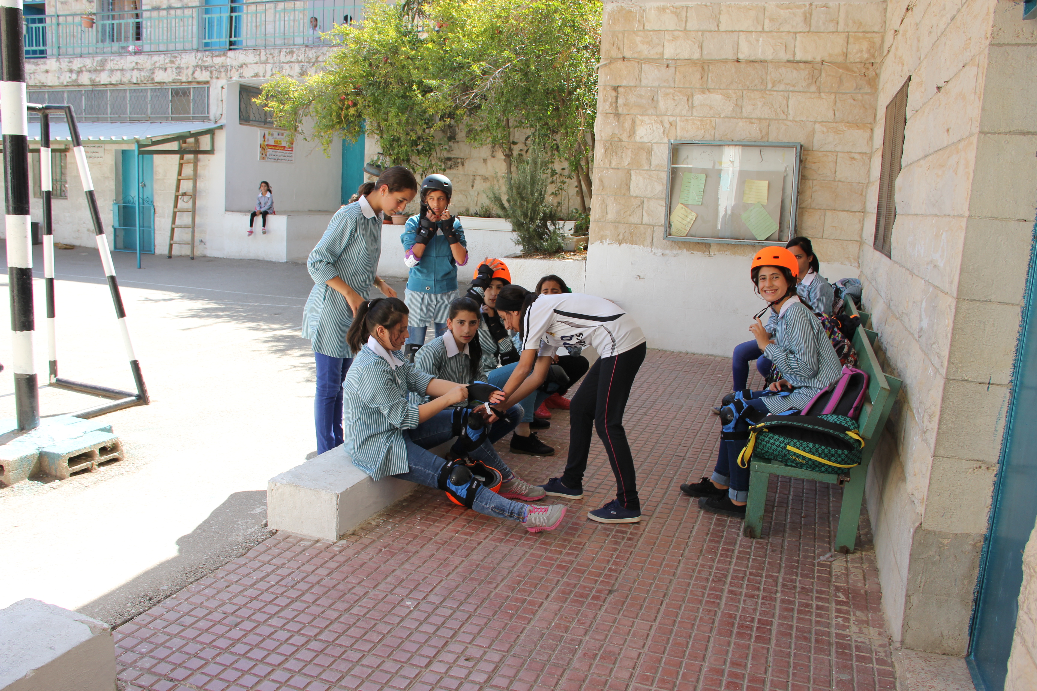 Last week Lilly, Charlie and I went to meet the head teacher of one of the local girl’s schools, to ask about setting up some classes with them. We went into the school with our skateboards, spoke to the teachers and gave a short demonstration on the playground. The girls at the school were so excited to see us. All the children here are very curious about us and are really friendly. Their excitement is partly about seeing a group of Western visitors, and the children are insistent on finding out our names and where we are from. Also, ‘selfie’ culture is rife amongst the youth of Palestine; it feels strange having your picture taken so frequently, but it’s lovely to feel welcomed.