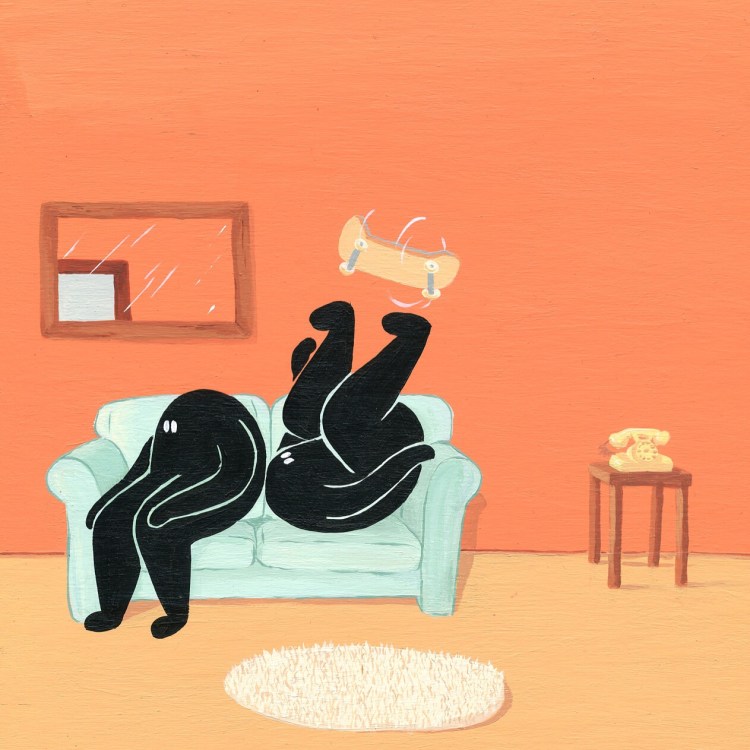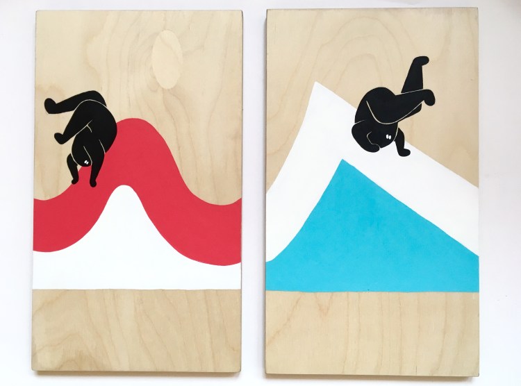Eloise’s work consists of small silhouette characters skateboarding and falling over in various colourful environments. The idea behind this is to create a microcosm of pure innocence. A selection of the paintings in the show are directly referenced to skateboarding and the architecture in San Francisco, while others are simply inspired by the weather and other light hearted aspects of the area.