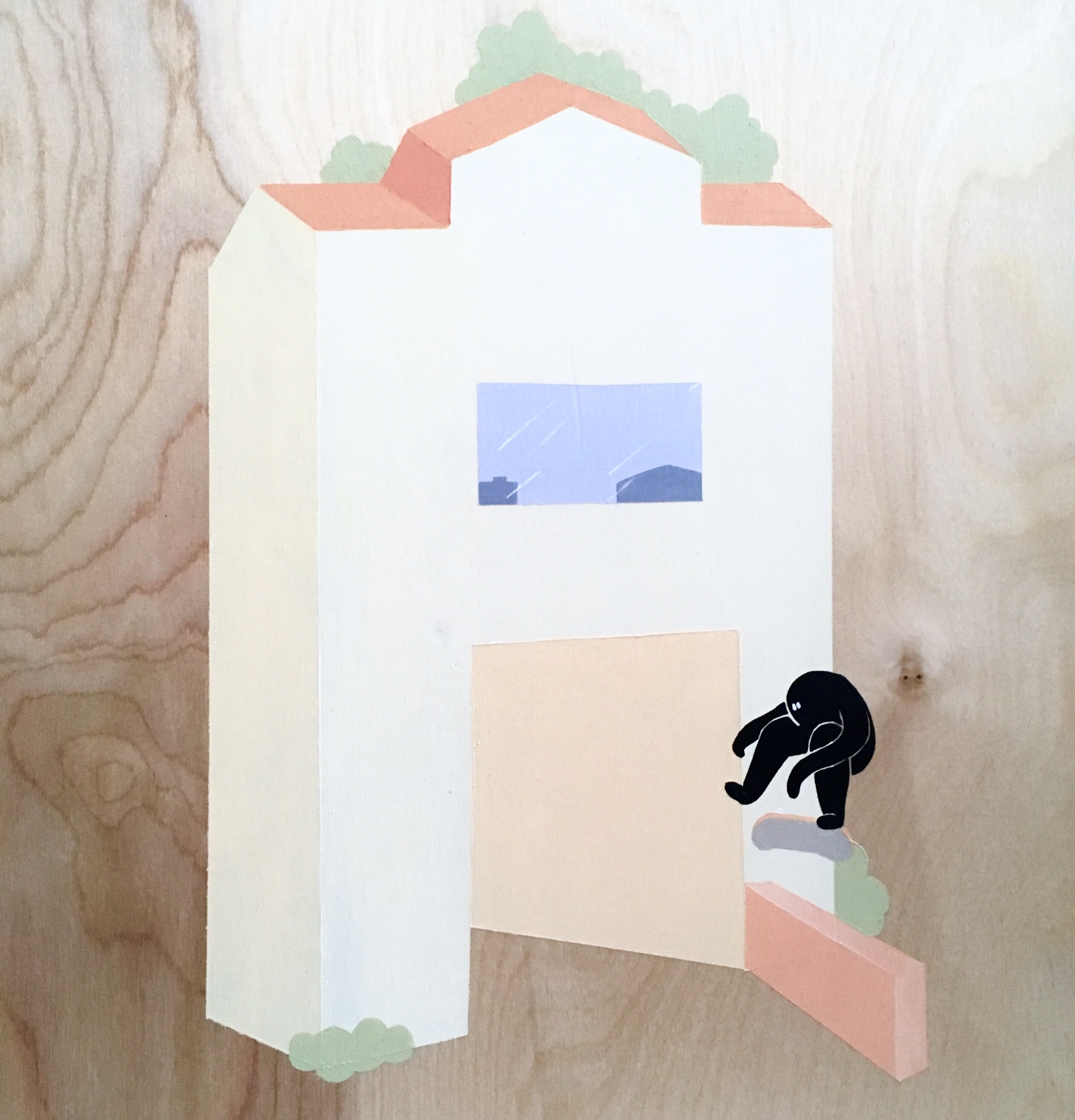 All of the paintings exhibited are painted with acrylic, either on plywood and broken skateboards, with a few exceptions on perspex. Wood is mainly used as she finds it holds blocks of bright/light colours well, which is important for the effect that Eloise tries to achieve with her work. Painting on the back of perspex creates a flat, cartoon-like look which is also effective for the theme.