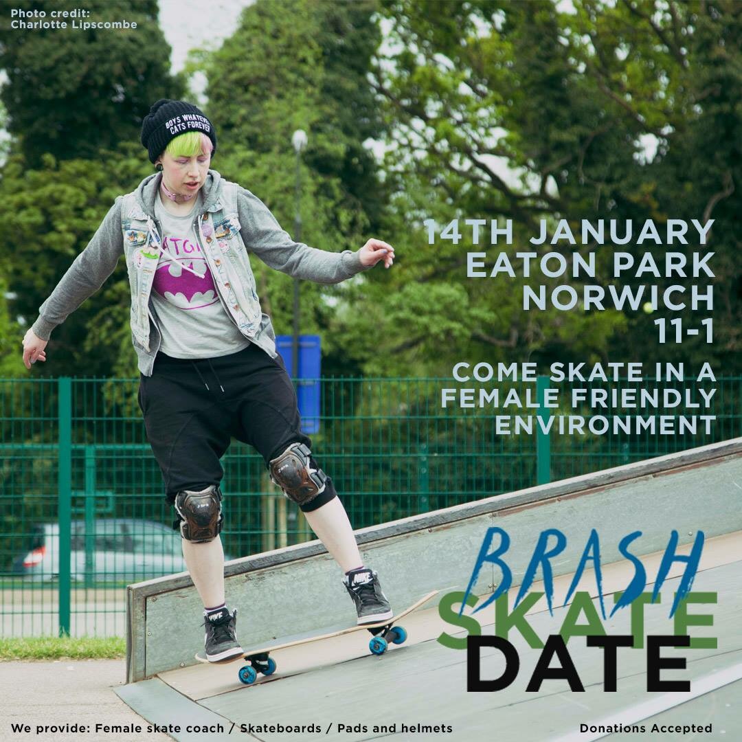 Come to our first Skate Date of the year (Sat 14th Jan in Norwich) to try out skateboarding. And you don’t even have to own a board! Brash has skateboards and safety pads/helmets.