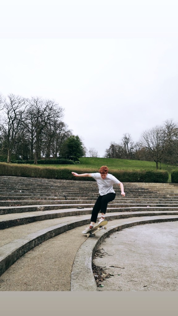 More recently, I’ve also been thinking about the ways that I feel and fit into the dominant skate ‘scene’ in Glasgow. I’ve realised that to be accepted and mostly unquestioned in such a typically masculine environment is a big part of the appeal and euphoria for me. To be somewhere where my masculinity works in my favour is a welcome antidote to existing in wider society where I have often been discouraged or punished for expressing masculinity.