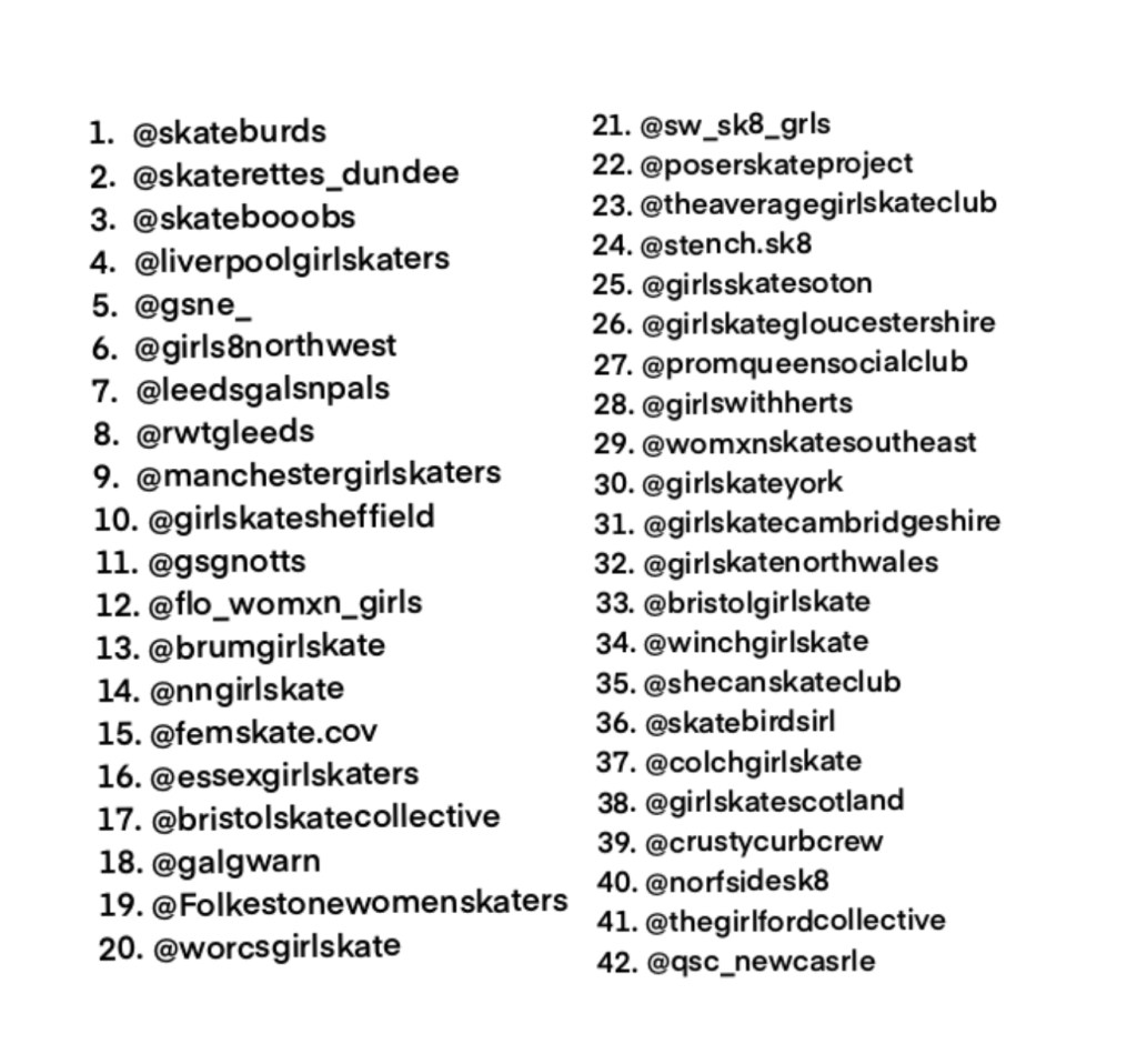 We have compiled a list of womxn and non binary skate collectives across the UK that have their own Instagram groups. Find them and get in touch to see when the next session is!
