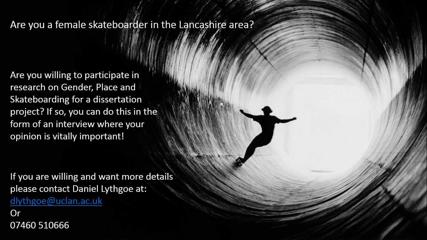 If you are a Lancashire based girl skater and up for being interviewed for a research paper on gender in skateboarding, then shoot an email to dlythgoe@uclan.ac.uk to get involved.